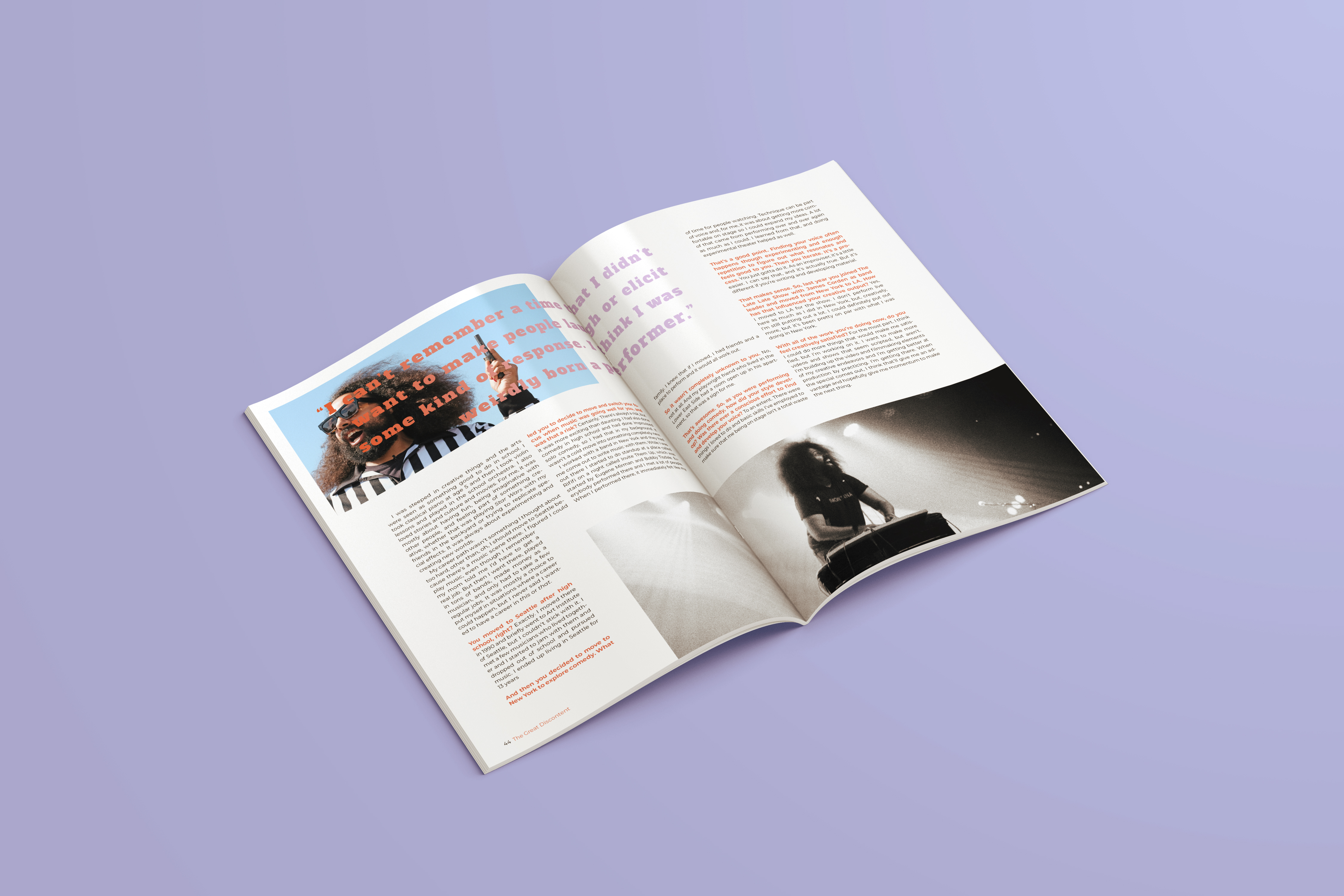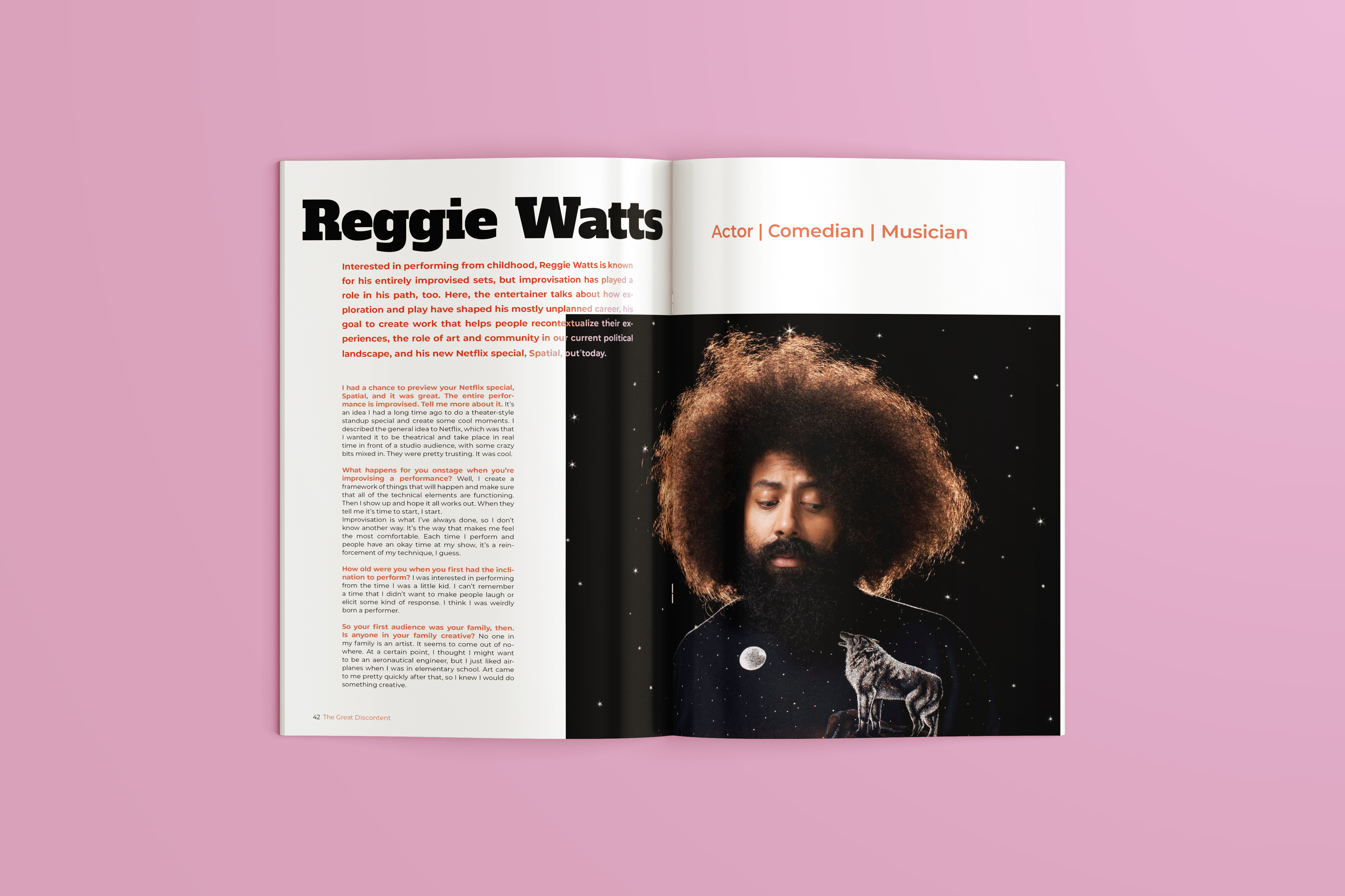 For this project I took an interview with entertainer Reggie Watts from the magazine The Great Discontent and laid it out across several spreads. In designing the layout and choosing photographs I aspired to emulate the energy and playfulness that Reggie puts into his performances.